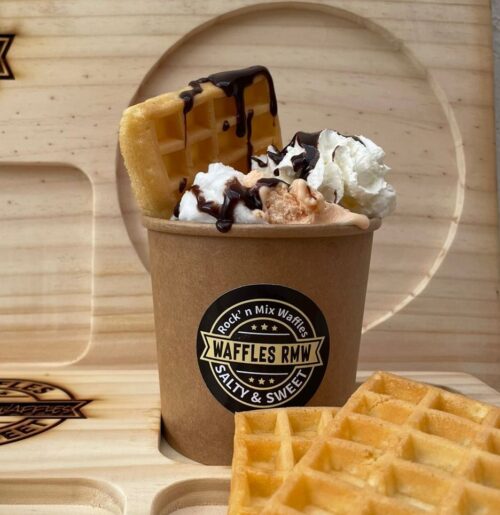 Medio waffle, 2 bolas de helado, chispita de color, Chantilly y salsa de chocolate