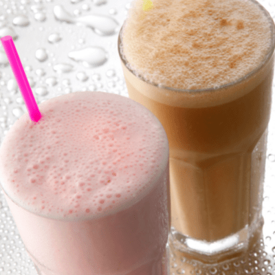 Bebida Preparada a base de leche, helado de frutilla y crema chantilly.